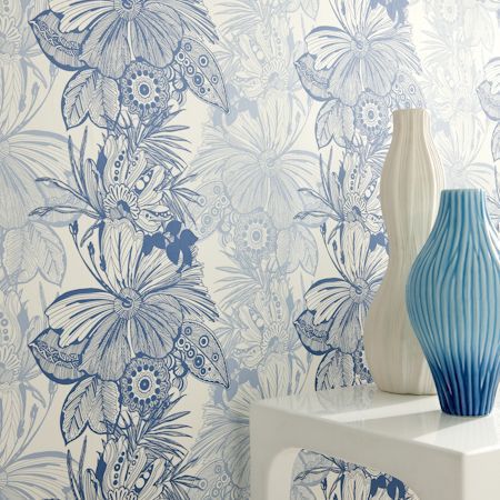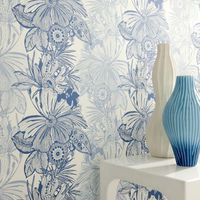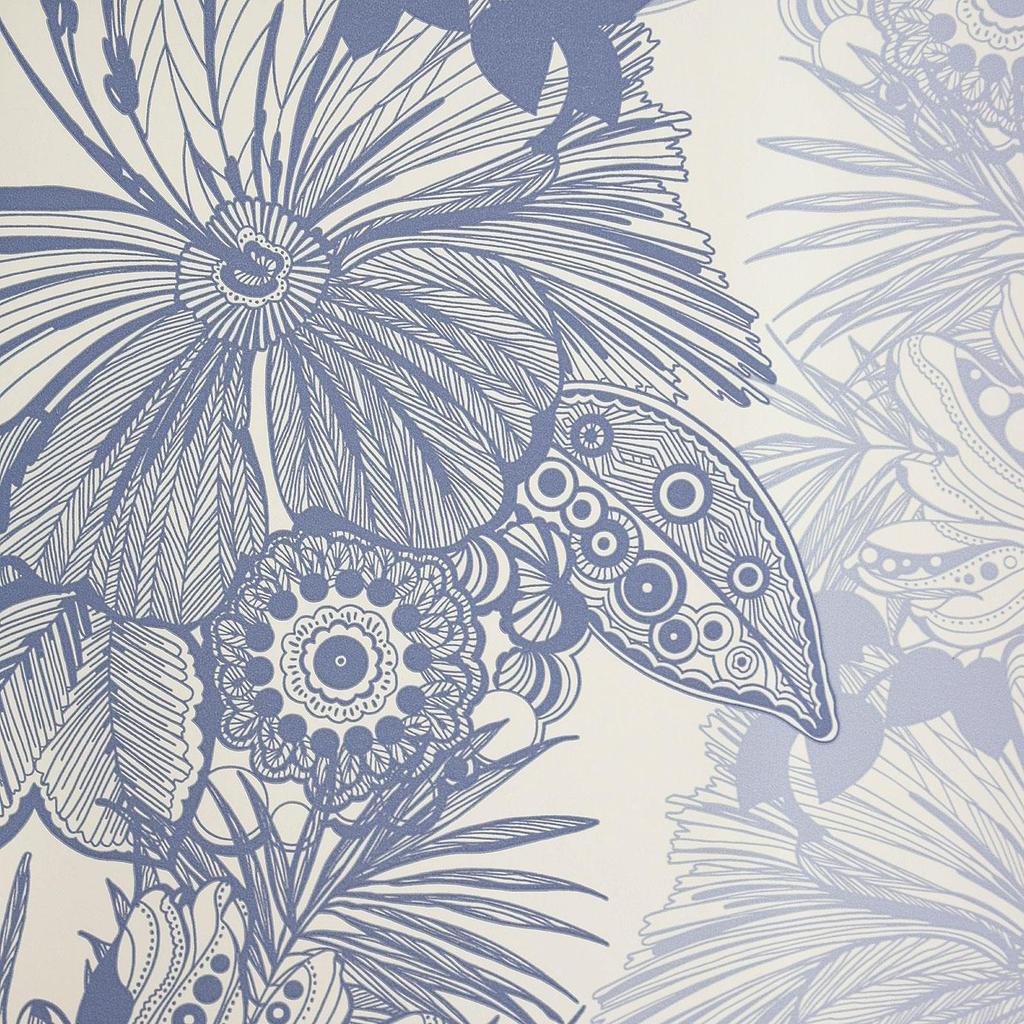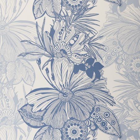 Piękne tapety ścienne angielskiej firmy Clarke&Clarke idealne do salonu i sypilani. Niebieskie kwiaty na jasnym tle.